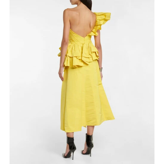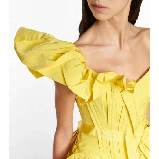 Turn heads in this spectacular asymmetrical gown from Alexander McQueen. Made from yellow faille, the striking style features romantic ruffled detailing juxtaposed with boning on the bodice to accentuate the waist.