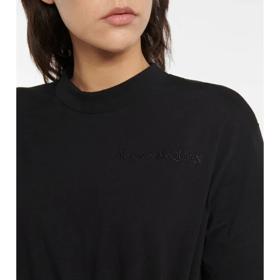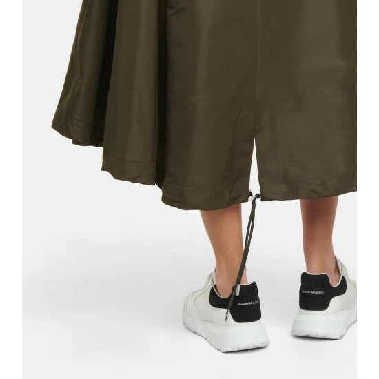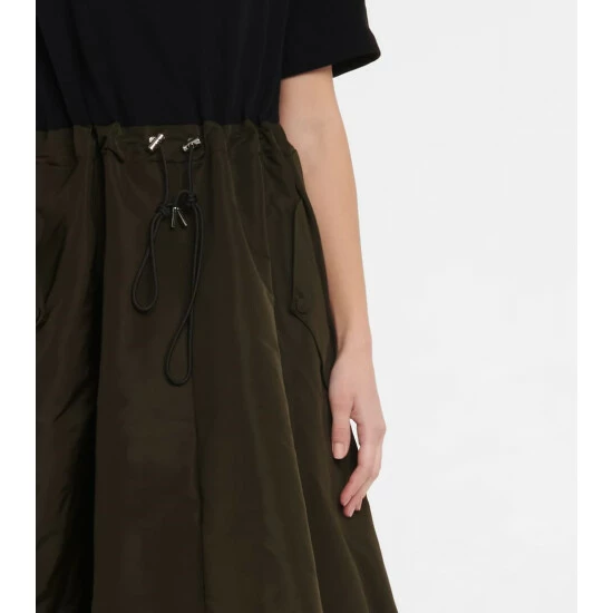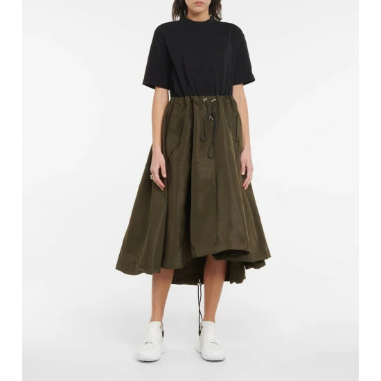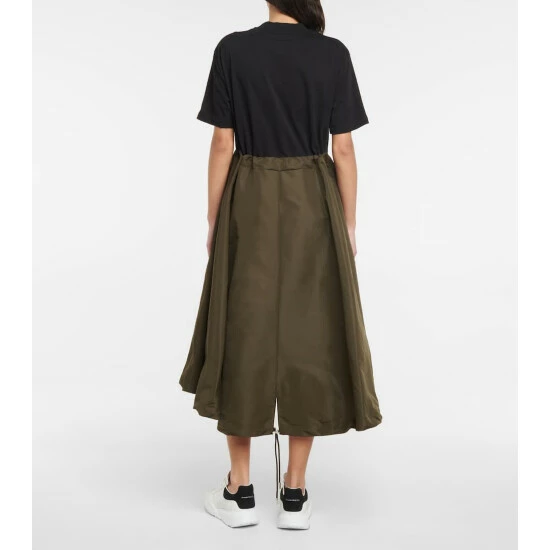 This dress showcases Alexander McQueen’s typical exploration of volume and contrasting textures. Its T-shirt-style cotton jersey bodice connects to a voluminous faille midi skirt that’s inspired by parka designs.