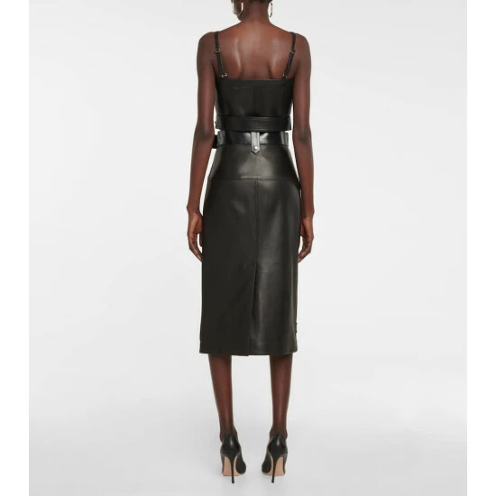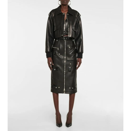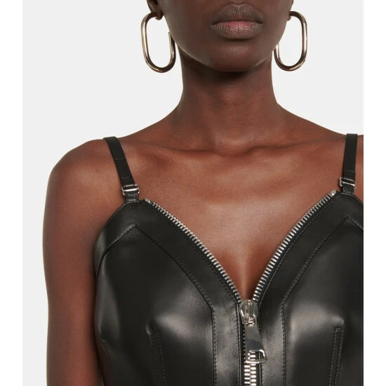 This Alexander McQueen bustier top is made from leather with structuring darts. Modeled after biker jackets, it features an eyelet belt and zipped front that’s bound to be styled a little undone.