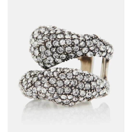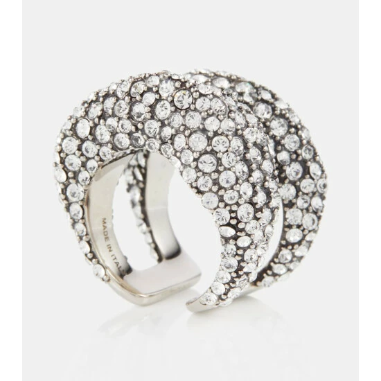 Romance and gothic charm go hand in hand in Alexander McQueen’s jewelry designs, as this chunky ring. Made from brass in antique-silver tone, it’s embellished with pave-set Swarovski crystals.