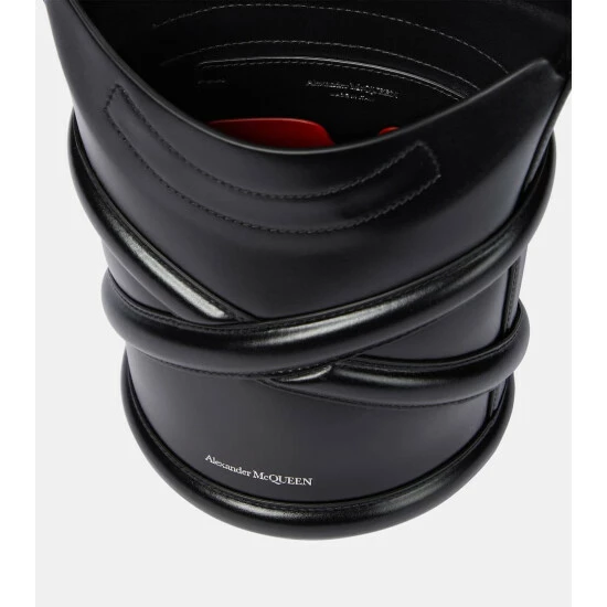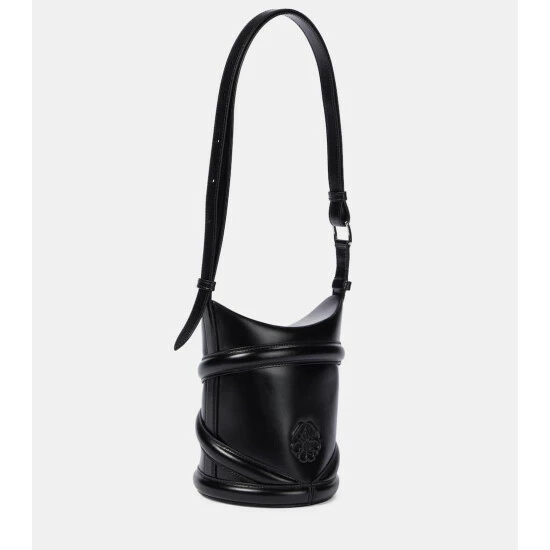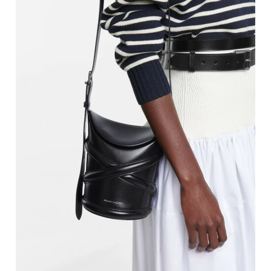 The piped trims featuring on the Curve Small bucket bag are inspired by the harness-style straps synonymous with Alexander McQueen. Made in Italy from smooth calf leather, this structured design has a magnetic flap top and a long, adjustable strap that can be styled both over the shoulder and across the body.