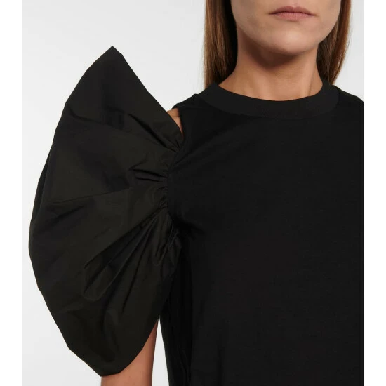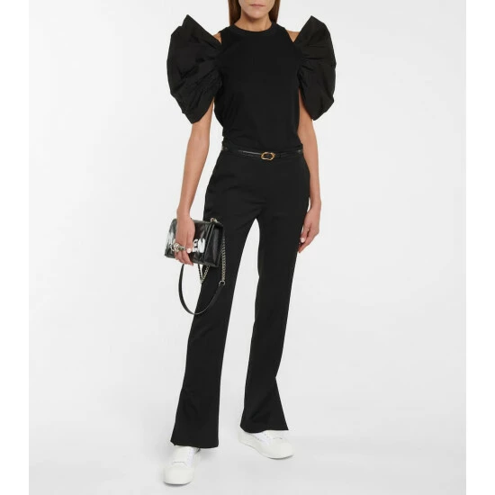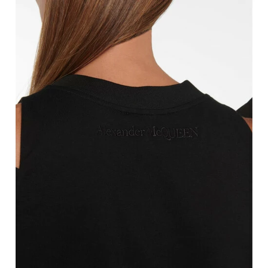 Alexander McQueen’s penchant for sculptural silhouettes is evidenced by this cutout cotton top. In timeless black, it’s defined by gathered puffed cap sleeves and exposed shoulders.