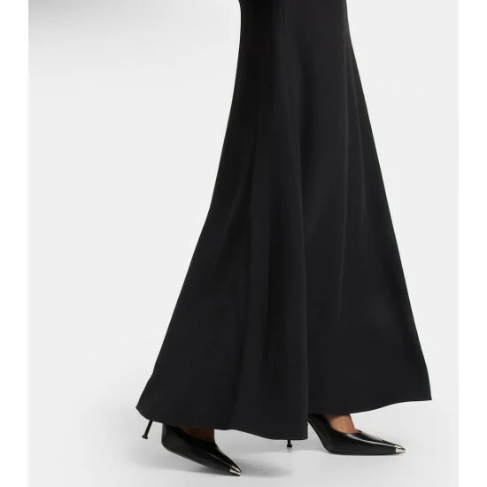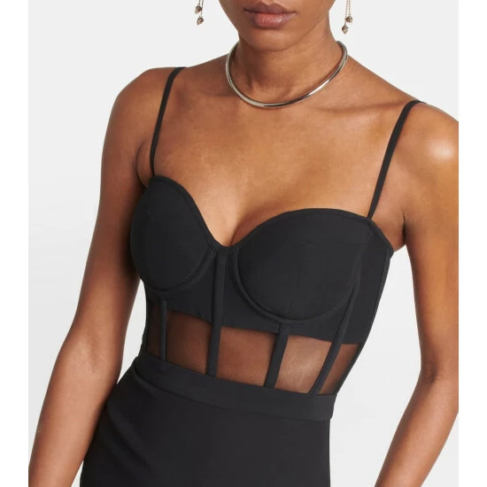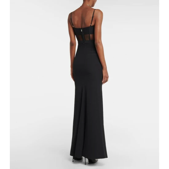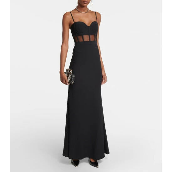 This bustier gown showcases Alexander McQueen’s affinity for sculptural silhouettes. Held up by adjustable shoulder straps, this crêpe style features a tulle panelled corset that extends into a fluid, floor-grazing skirt.