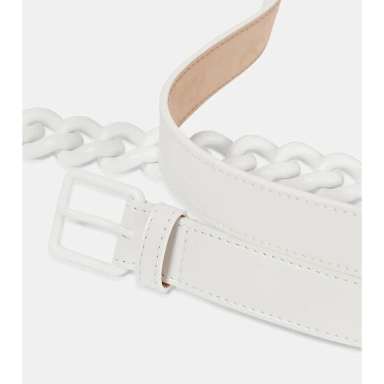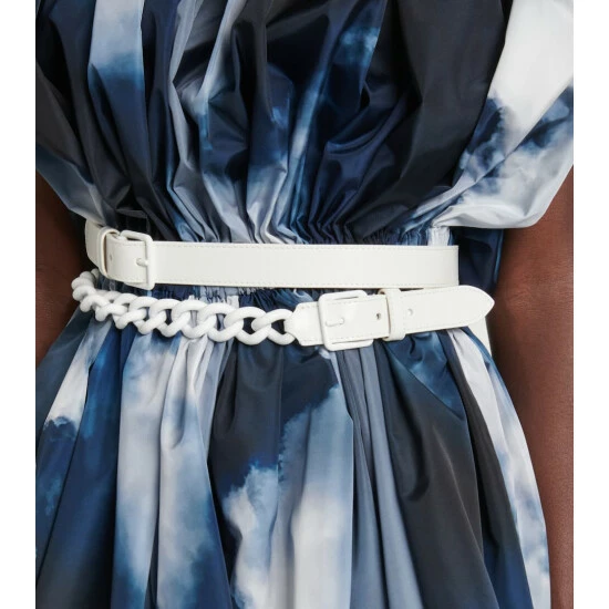 Alexander McQueen updates its fan-favorite Double belt for the new season with a chain. Made from leather and white hardware, this piece will make a statement set against the label’s printed dress styles.