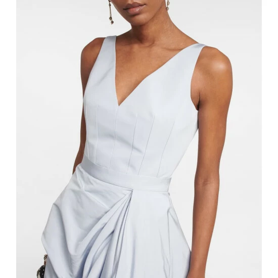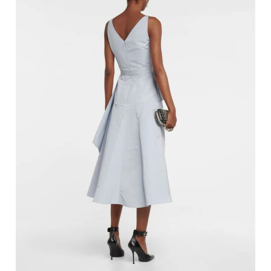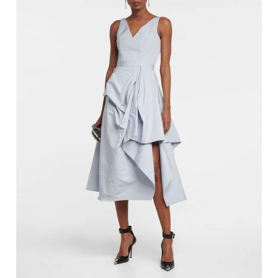 This midi dress from Alexander McQueen is made in Italy in a sleeveless A-line silhouette. The bodice has a V-neckline and dart detailing while an artfully draped skirt flares out and is partly asymmetrically-gathered to the cinched waist.