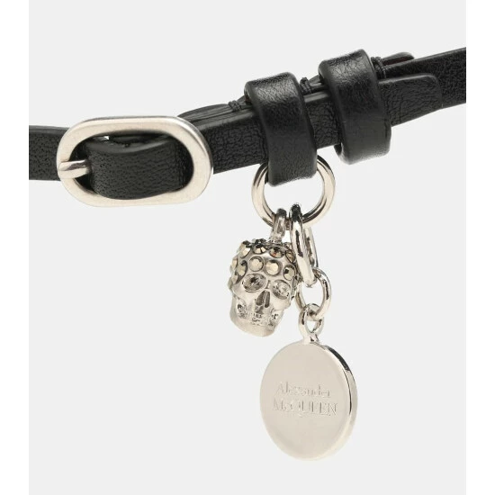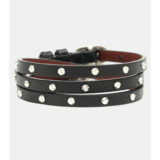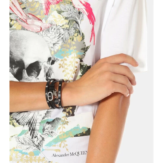 Evoke a rock ‘n roll aesthetic with this embellished bracelet from Alexander McQueen. Crafted from strips of black leather, the style wraps around the wrist and features a logo-embossed pendant and signature skull charm.
