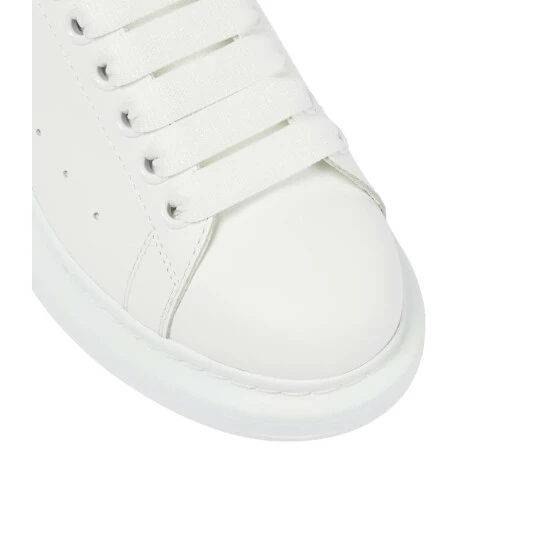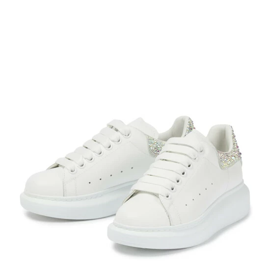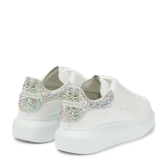 Crafted in Italy from pristine white leather, these sneakers from Alexander McQueen merge glamour with comfort. Set on rubber platform soles, the design features shimmering crystal embellishment at the heels.