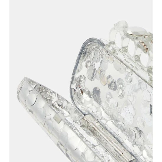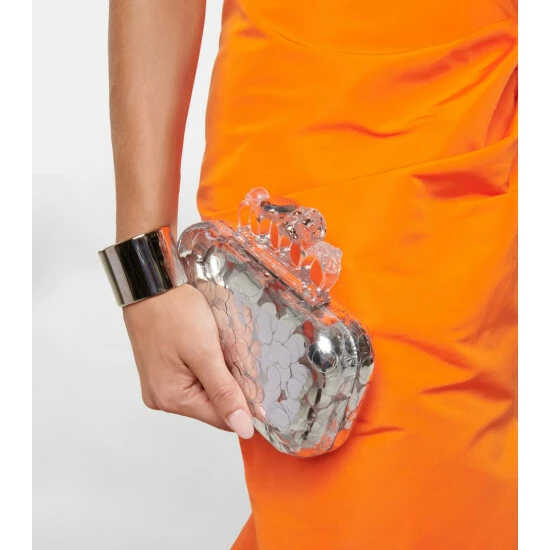 The Four Ring box clutch from Alexander McQueen will see you through any soirée. Made from clear plexiglass with silver circles, it has a knuckle-duster clasp that’s encrusted with signature skulls and hand-applied Swarovski crystals.