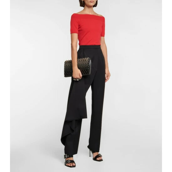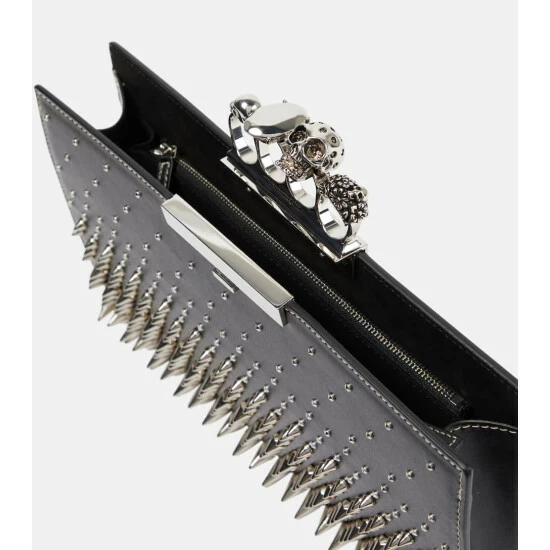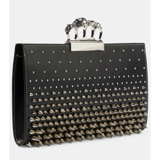 Alexander McQueen’s Four Ring clutch is topped with the brand’s iconic knuckle-duster clasp embellished with signature skulls and hand-applied Swarovski crystals. It’s made from smooth black leather with a striking assortment of studs and spikes.