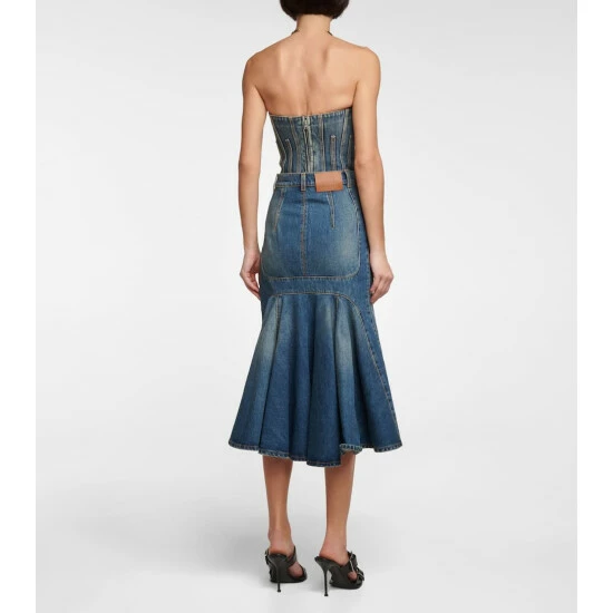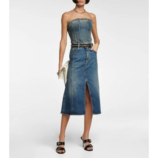 Made from cotton denim in a distressed wash, this high-rise mid skirt from Alexander McQueen has slit pockets and leather trims.