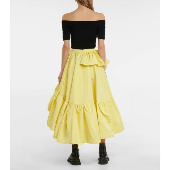 Architectural designs, like this high-rise midi skirt, are characteristic of Alexander McQueen’s contemporary design codes. Cut from polyfaille, this tiered design falls in ruffles to a wrap-around, asymmetric hem for enviably effortless chic.