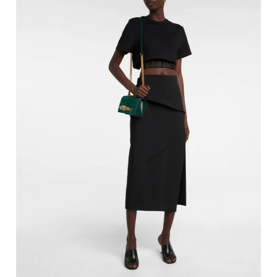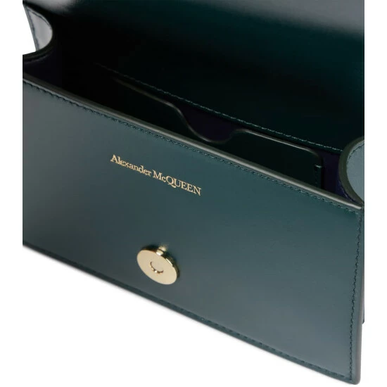 The Jewelled Satchel mini crossbody bag from Alexander McQueen is encrusted with crystal embellishments that nod to the label’s theatrical runway designs. Made from green leather, it opens to reveal a central compartment that’s completed with a slip pocket for easy organization.