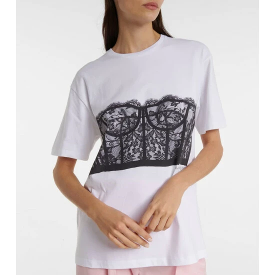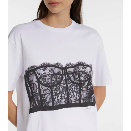 Alexander McQueen brings a romantic edge to this T-shirt. Cut from pure white cotton, the relaxed design has a bustier-style lace panel placed across the bodice.