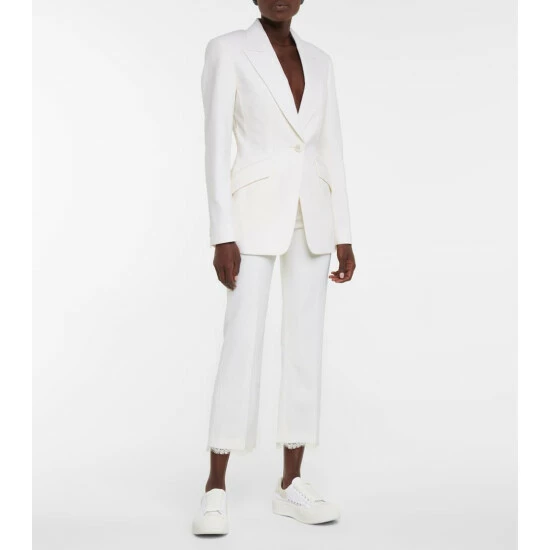 Alexander McQueen has the rare gift of reimagining tailoring heirlooms like this blazer with feminine design traits. Made from pure wool with a sharply structured front, this white piece is detailed with a semi-sheer lace panel at the back.