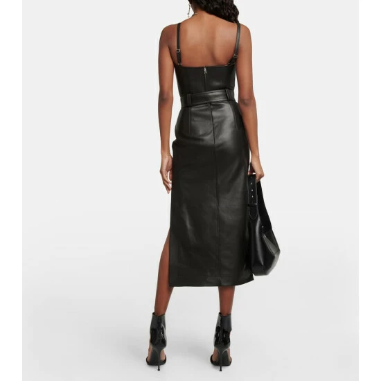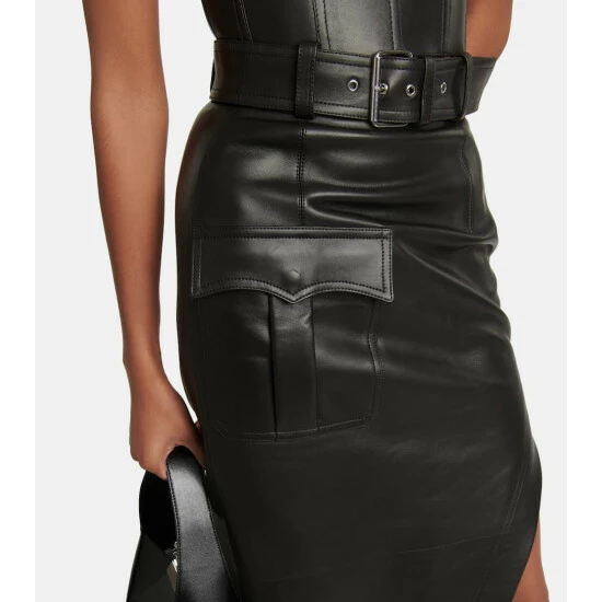 This midi skirt from Alexander McQueen is made in Italy from supple nappa leather. It has a fitted silhouette with an adjustable belt, an asymmetric side slit, and a flap pocket at the side.
