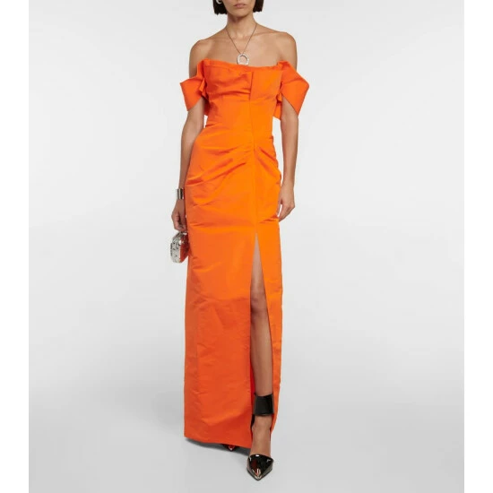 This off-shoulder maxi dress from Alexander McQueen showcases the brand’s exceptional craftsmanship. Made from bright polyfaille, it has a fitted bodice with ruching at the waist,and a high slit and the skirt.