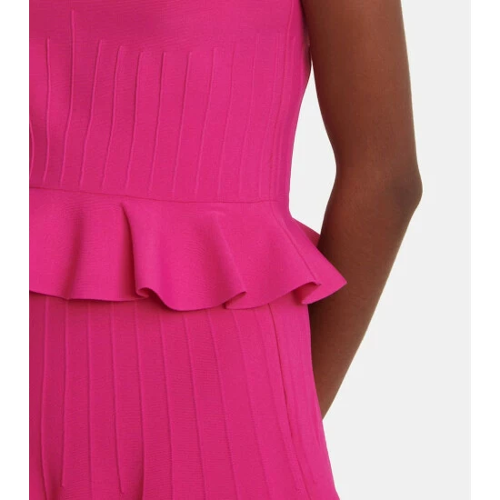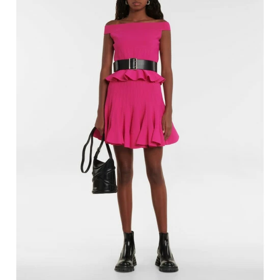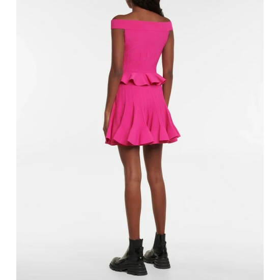 This top from Alexander McQueen features an off-shoulder neckline and a peplum waist. This structured design is made from a compact knit fabric with boning-inspired stitching.