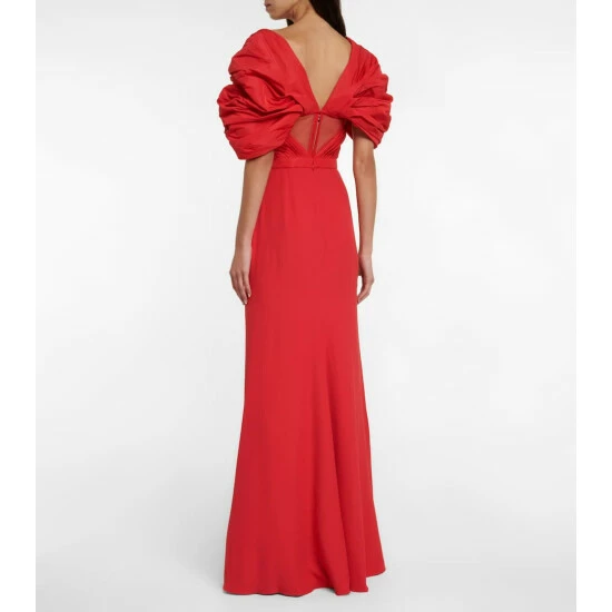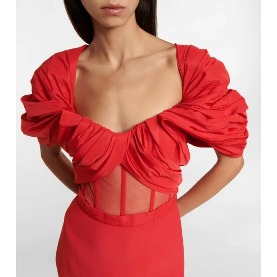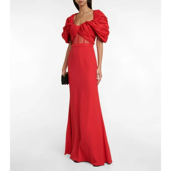 Make an alluring statement in this off-shoulder gown from Alexander McQueen. In a bold red, the style features voluminous pleated polyfaille sleeves, a semi-sheer exposed corset construction, and a fluid crรชpe floor-grazing skirt.