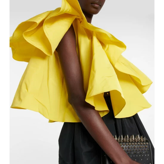 This crop top from Alexander McQueen is made from lustrous polyfaille that’s structured enough to hold its voluminous shape. It has a gathered one-shoulder silhouette and buoyant ruffles.