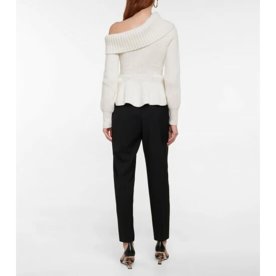 This flattering sweater from Alexander McQueen is designed with a one-shoulder neckline and fully fashioned peplum hem. It’s made from ribbed-knit wool with an element of cashmere for softness.