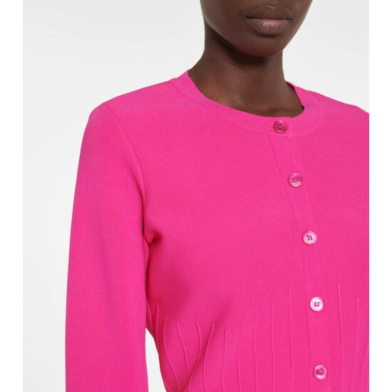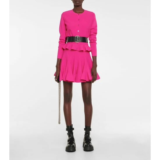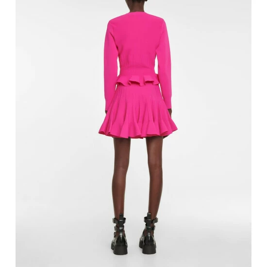 This bright pink cardigan from Alexander McQueen is detailed with boning-inspired stitching and a peplum frill. Wear it with the matching skirt.