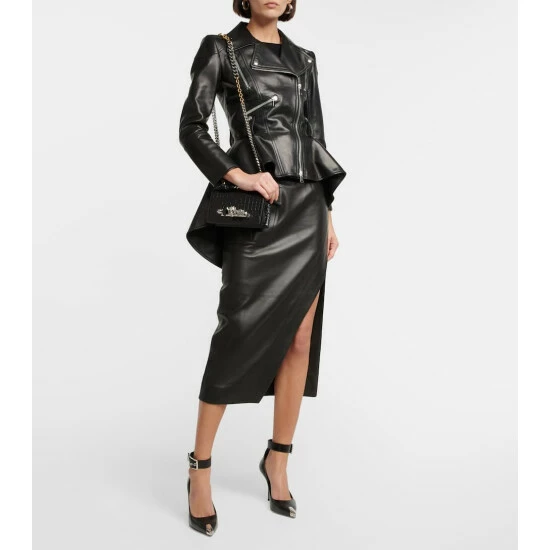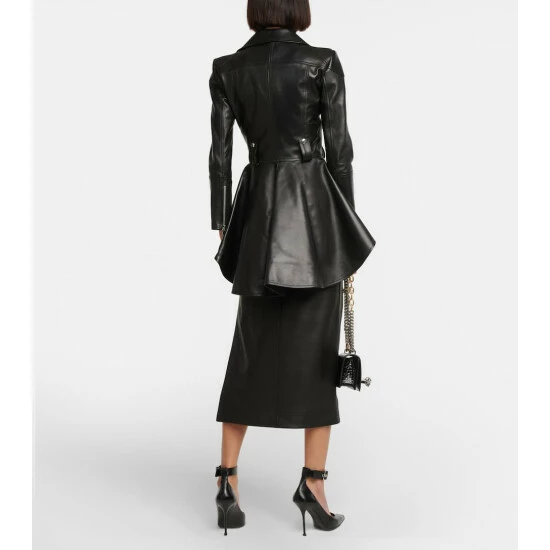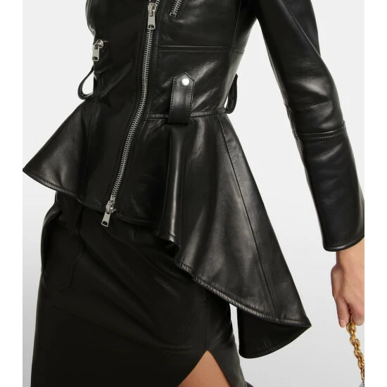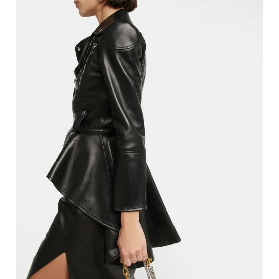 Alexander McQueen re-envisions the leather biker jacket with a fresh silhouette, courtesy of a peplum waist and frock-like back. The design is made from smooth lambskin with a partial silk lining and gleaming silver-toned hardware.