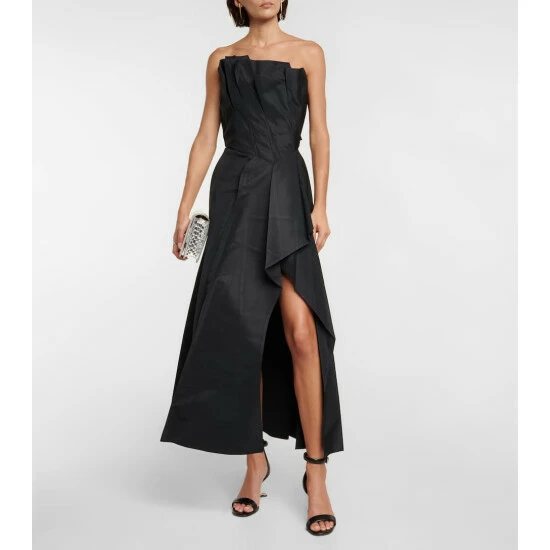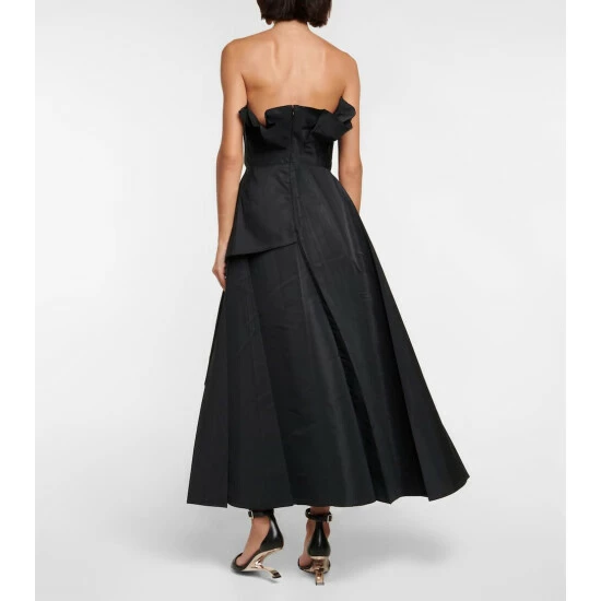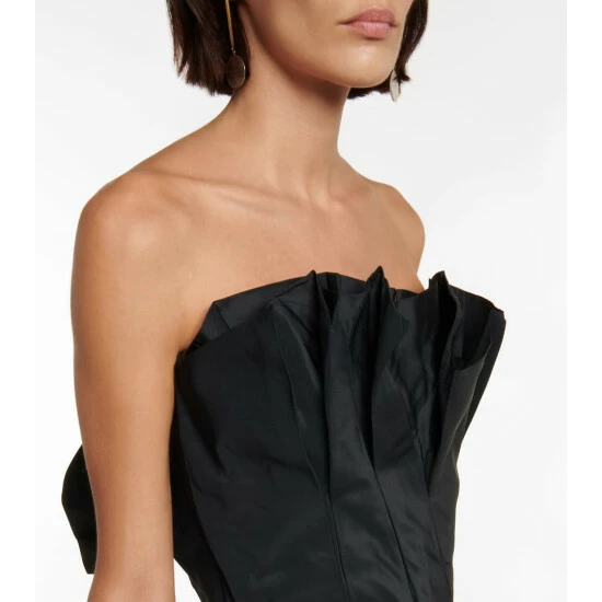 This strapless gown from Alexander McQueen has a ruffled bodice that recalls flower petals. It’s made from crisp faille β a construction that amplifies the design’s voluminous silhouette and sharp pleating.