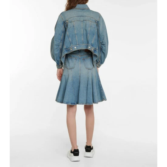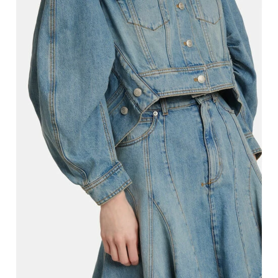 With its dramatic volume, this denim jacket could only bear Alexander McQueen’s label tag. Made from sturdy cotton denim that’s washed for a lived-in feel, the cropped design is framed by puffed sleeves.