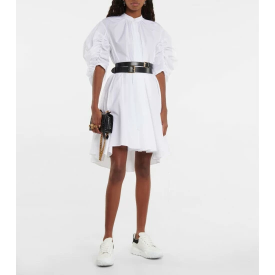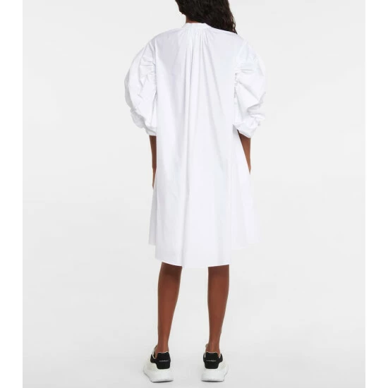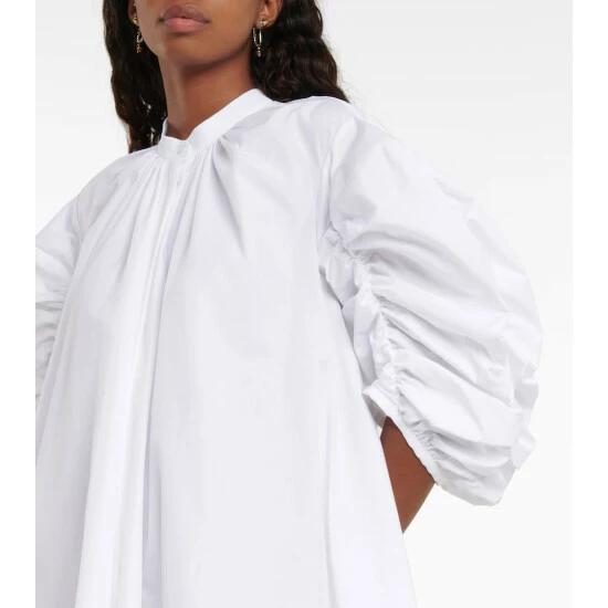 Showcasing the label’s affinity for dramatic silhouettes, this Alexander McQueen minidress steals the spotlight with ruched, puff sleeves. It’s cut from cotton to a loose fit with a gathered neckline and wide hem.