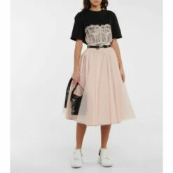 Inspired by the flattering silhouettes of the ’50s, this tulle-layered midi skirt from Alexander McQueen is cut to a high-rise swing shape. It has a cotton lining and a ruffled trim.