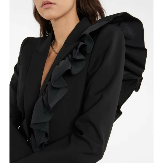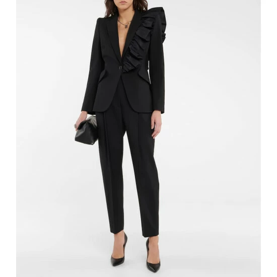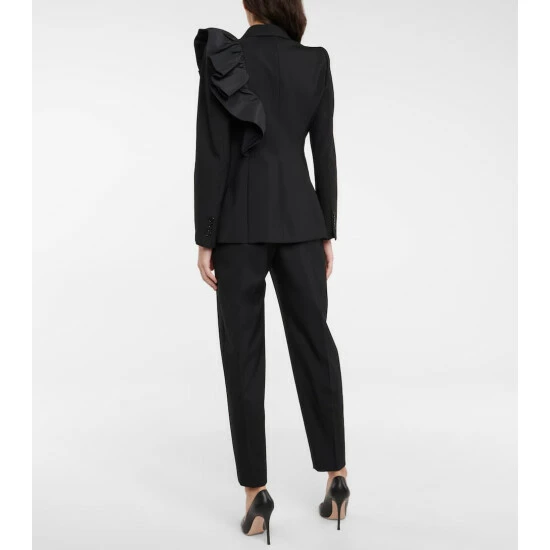 Look to Alexander McQueen for cutting-edge tailoring like this blazer. Made from fine wool twill and adorned with a sculptural faille ruffle, it has two vents in the back and slanted flap pockets.