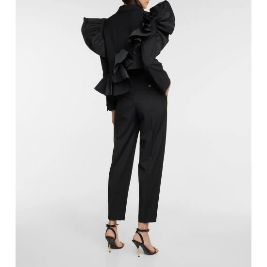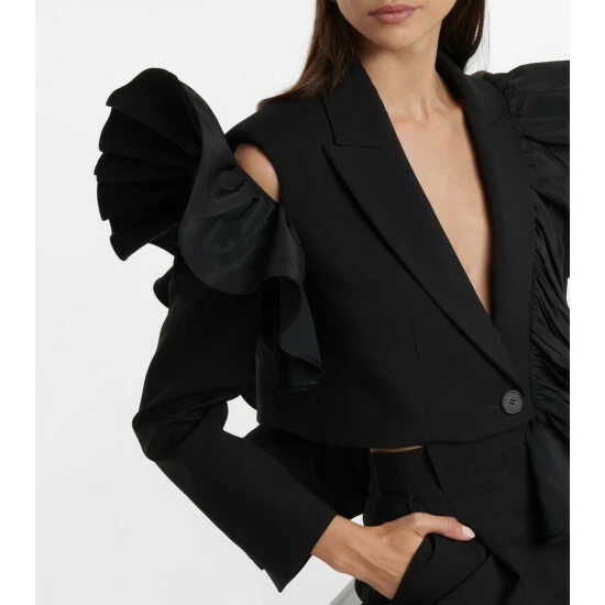 Alexander McQueen has an obvious bent for dramatic styles, as this blazer shows. Made from wool, the cropped silhouette is framed with asymmetrically placed faille ruffles and a cutout shoulder.