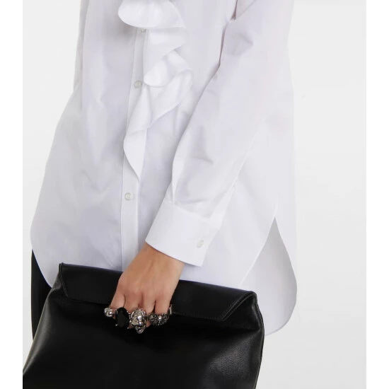 Alexander McQueen reimagines the classic white shirt with a romantic ruffle to one side of the placket. Made from cotton poplin, this piece has a longline silhouette with a high-low hem.