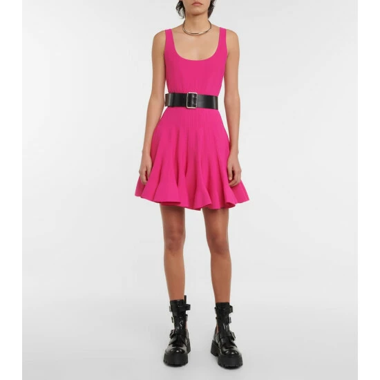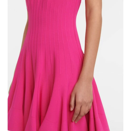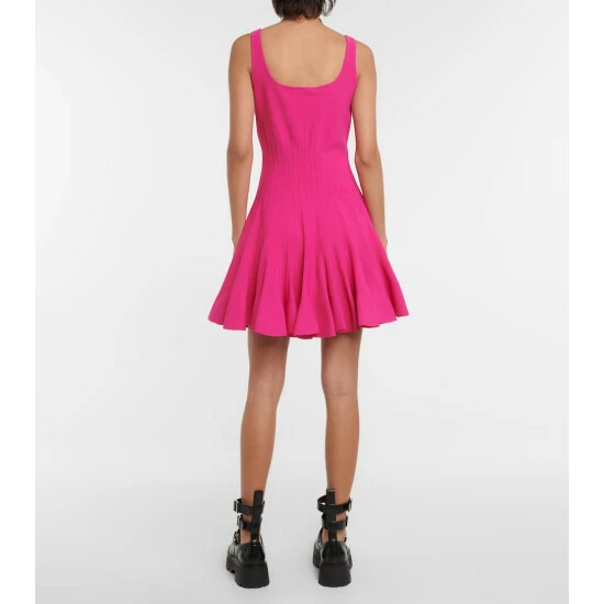 This minidress from Alexander McQueen has godet pleats that softly flare outwards. Made from a compact knit fabric with corsetry-inspired stitching, it’s a sleeveless design with a square neckline.