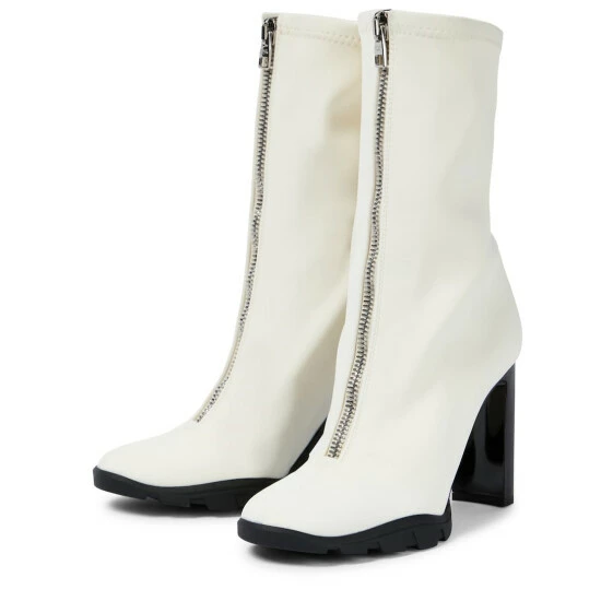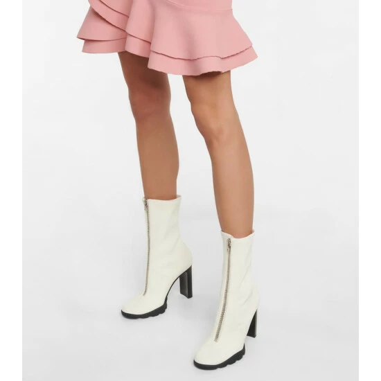 Elevate your ensemble with Alexander McQueen’s Slim Tread ankle boots. They’re made from white sock-like scuba fabric and rest on lacquered leather heels with sneaker-inspired rubber outsoles.