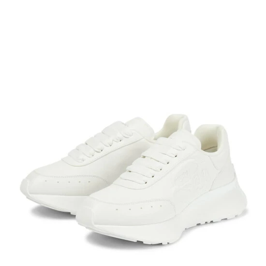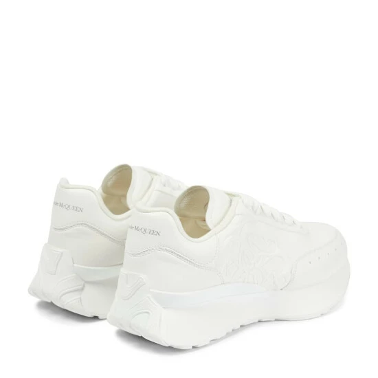 Fit to conquer any terrain, Alexander McQueen’s Sprint sneakers sit on wide, chunky runner soles that run up the heels. They’re made from white leather with tonal logo embossing on the lateral sides.