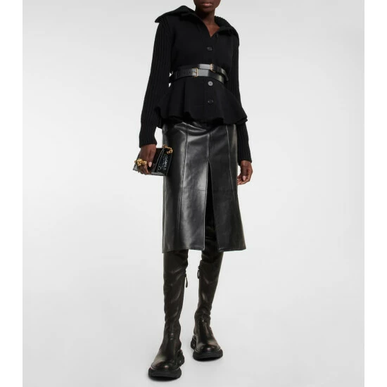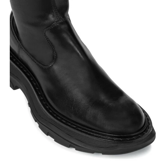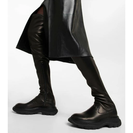 Boots from Alexander McQueen always ensure a confident stride, particularly where this Tread over-the-knee pair are concerned. This thigh-skimming style is made from black “stretch” lambskin leather that’s supple enough to provide a svelte, almost second-skin fit. The cut widens slightly at the top of the necks, allowing you to move comfortably.