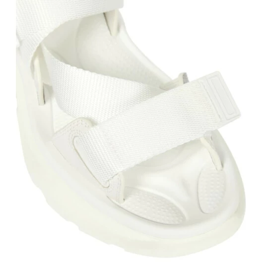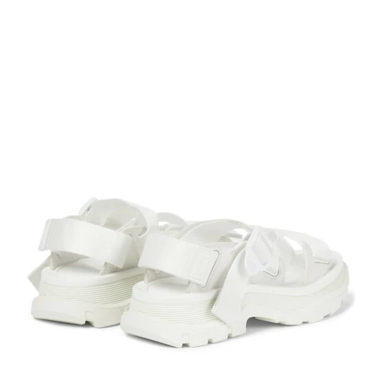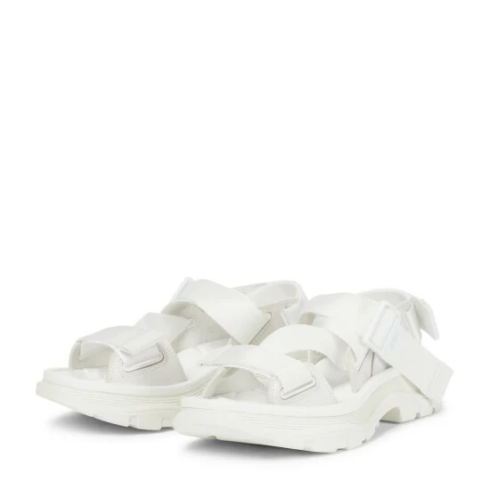 The rubber soles of Alexander McQueen’s Tread sandals are so much more than a fashion statement – they’re an ergonomic feature that supports the wearer’s feet. The remainder of the design, in classic white with leather and webbed straps, takes the form of classic trekking footwear.