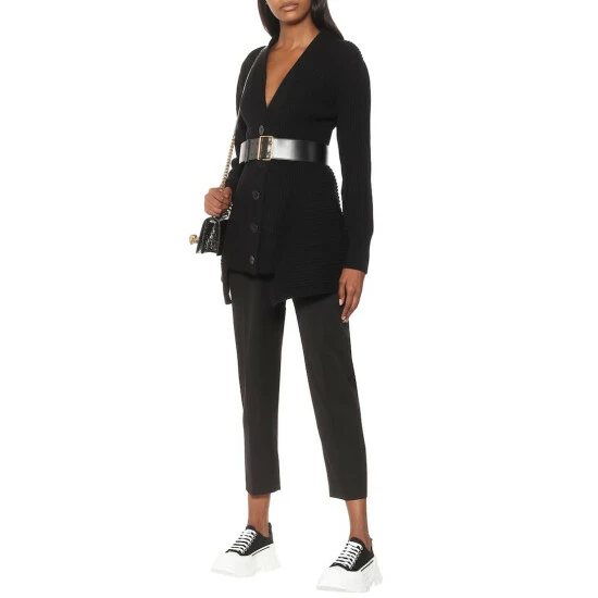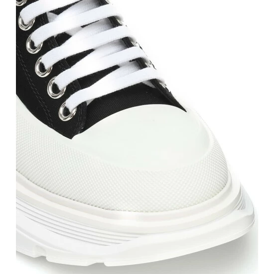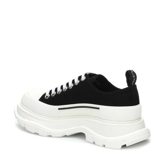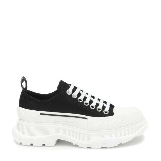 Executed here on platform sneakers, Alexander McQueen’s Tread Slick soles have become a defining feature of the house’s footwear. Made from black canvas and white rubber, they tread that fine line between smart and casual with aplomb.
