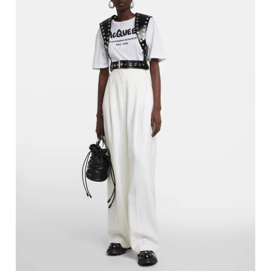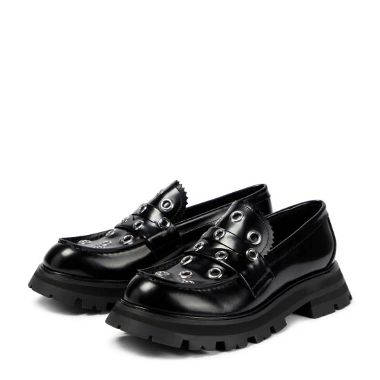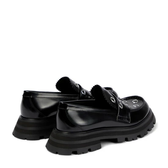 Alexander McQueen reimagines the iconic Wander loafers with silver-toned eyelet embellishments. Made from polished calf leather, they feature zigzag trims, rounded toes, and exaggerated flared rubber lug soles.
